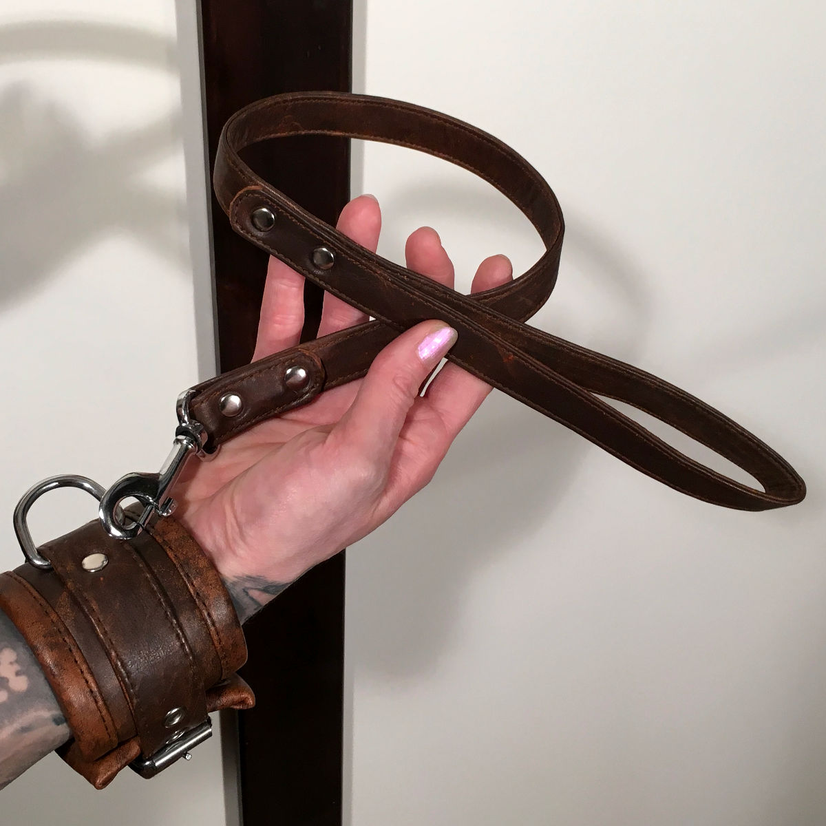 Die Leine passt sich dem Design des Halsbandes und der Fesselmanschetten aus der Wotan-Serie in antique-braun genauso gut an, wie vielen Kleidungsstücken in braun.