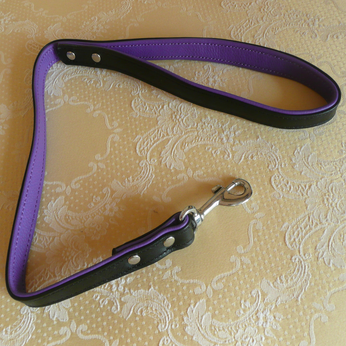Die Aussenseite der Leine ist schwarz, während die Innenseite farblich abgesetzt ist und sich so dem Design des Halsbandes und der Fesselmanschetten anpasst.