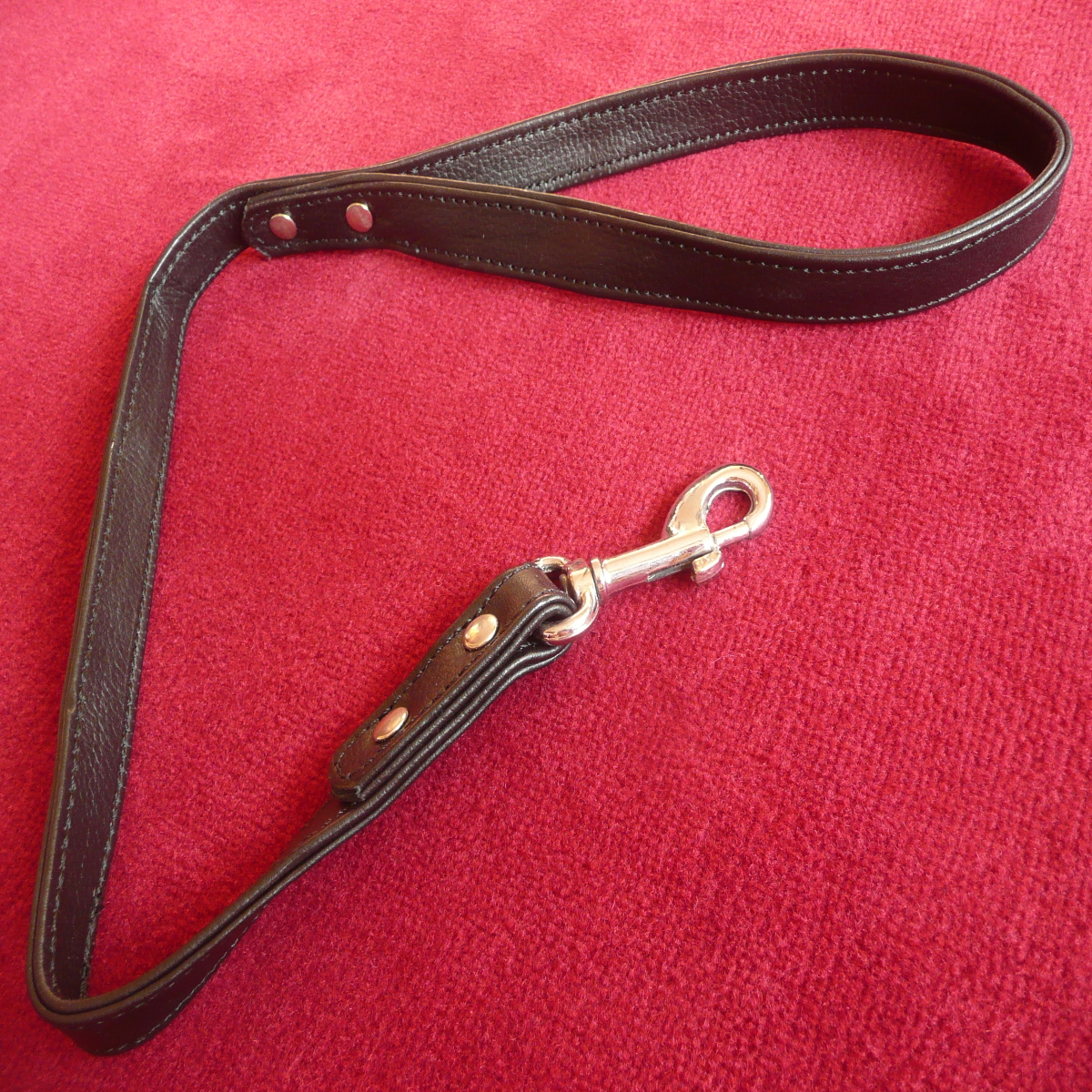 Die Wotan-Führleine wird vollständig aus Nappaleder genäht und lässt sich mit einem kleinen Karabinerhaken am Halsband anklinken.