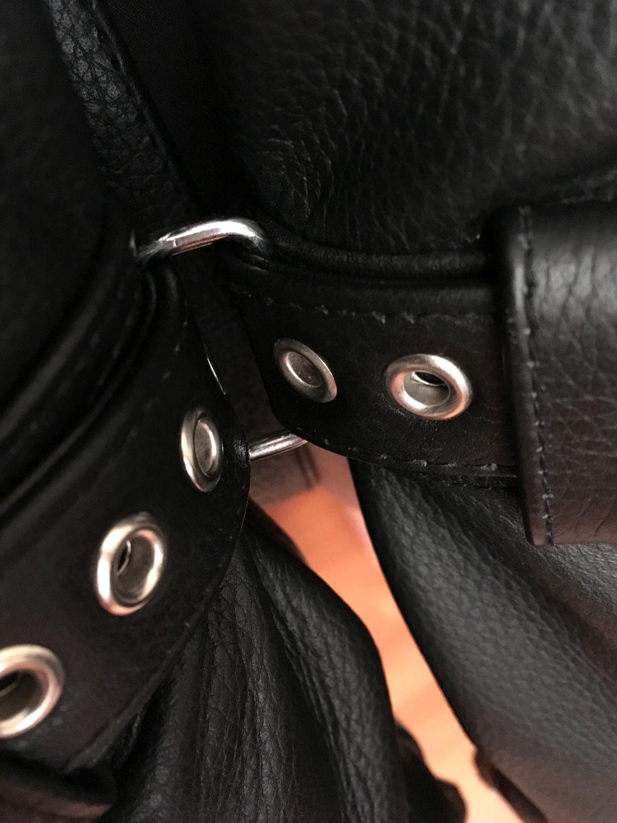 Durch diese können die Zusatz-Riemen gezogen werden um beispielsweise die Hände am Oberarm zu fixieren, eine bequemere Fixierung als die sehr restriktive Fesslung des Mono-Handschuhs (siehe Bild 3).