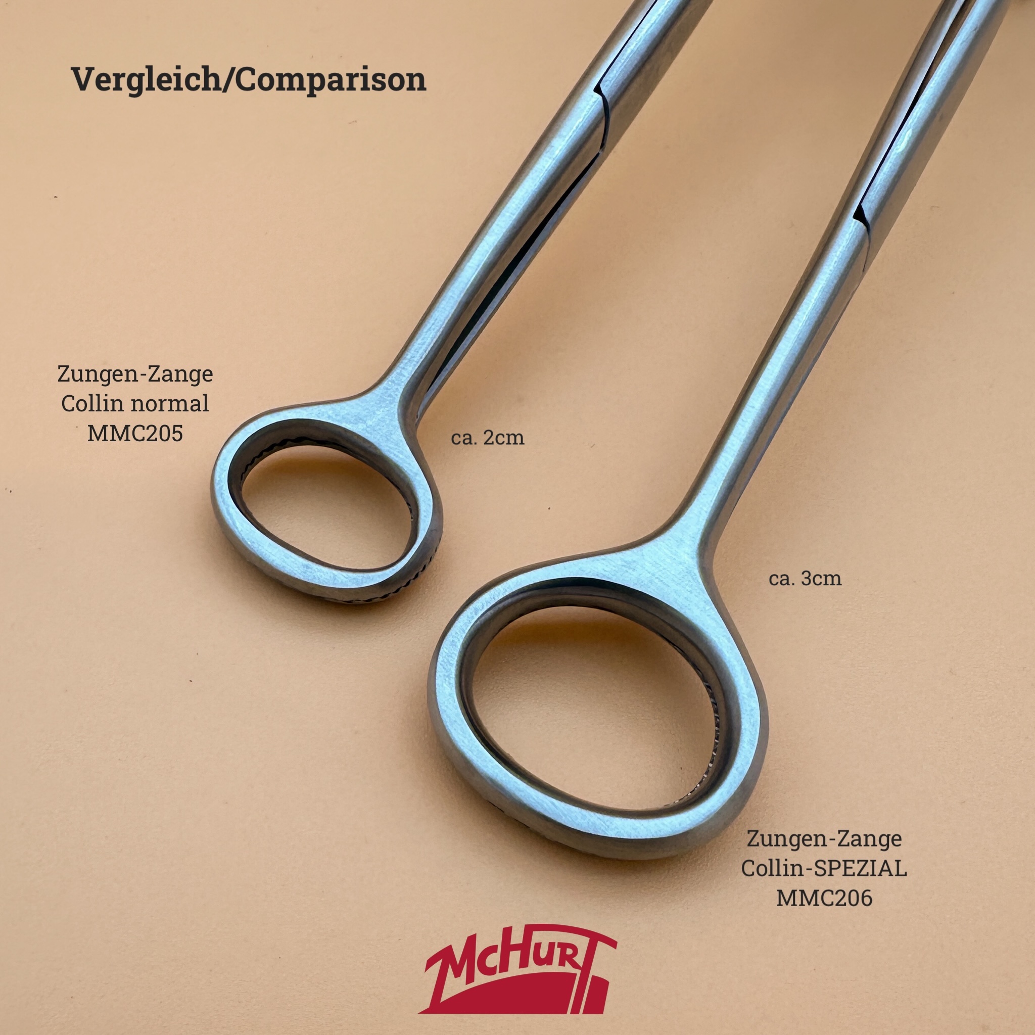 Im Vergleich zur Zungen-Zange Collin normal ist der Kopf dieser Zange mit ca. 3cm Breite etwas größer und kann somit mehr Oberfläche greifen.